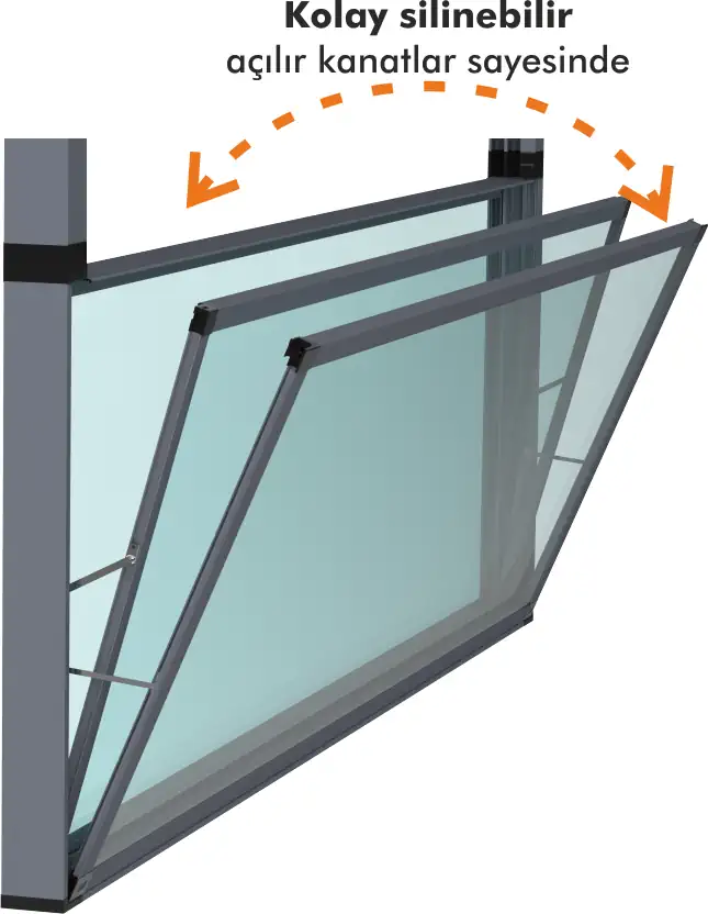 Bks IOT silinebilir giyotin sisteminde camların rahatlıkla silinebilmesi için özel olarak tasarlanmış paslanmaz açılır kanatlar ile kolay temizlik imkanı.